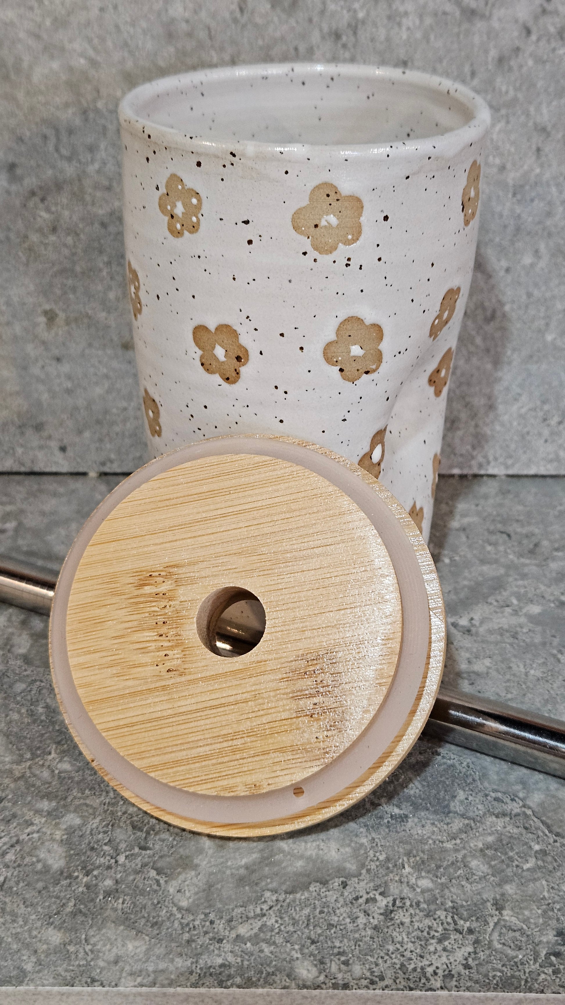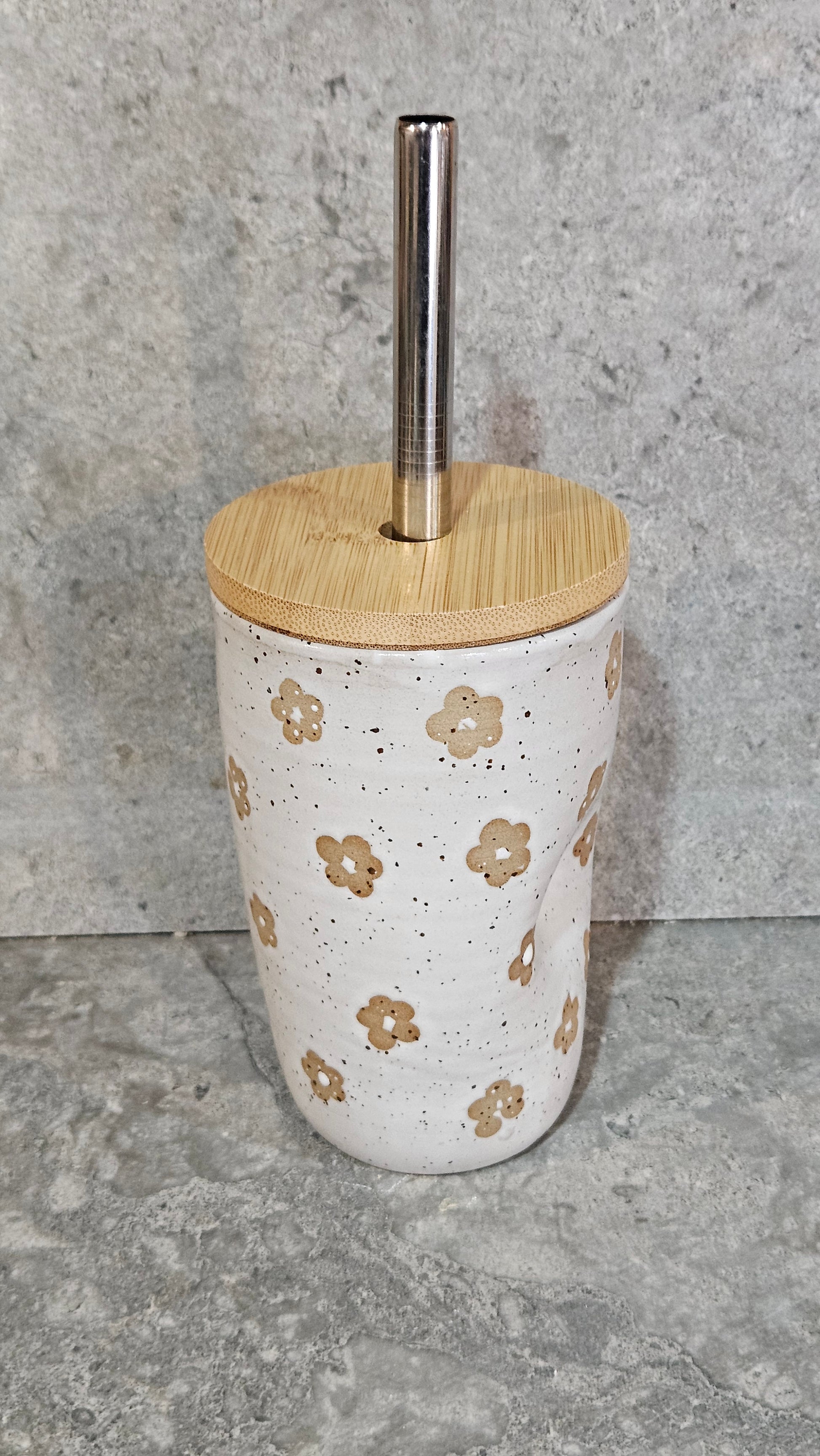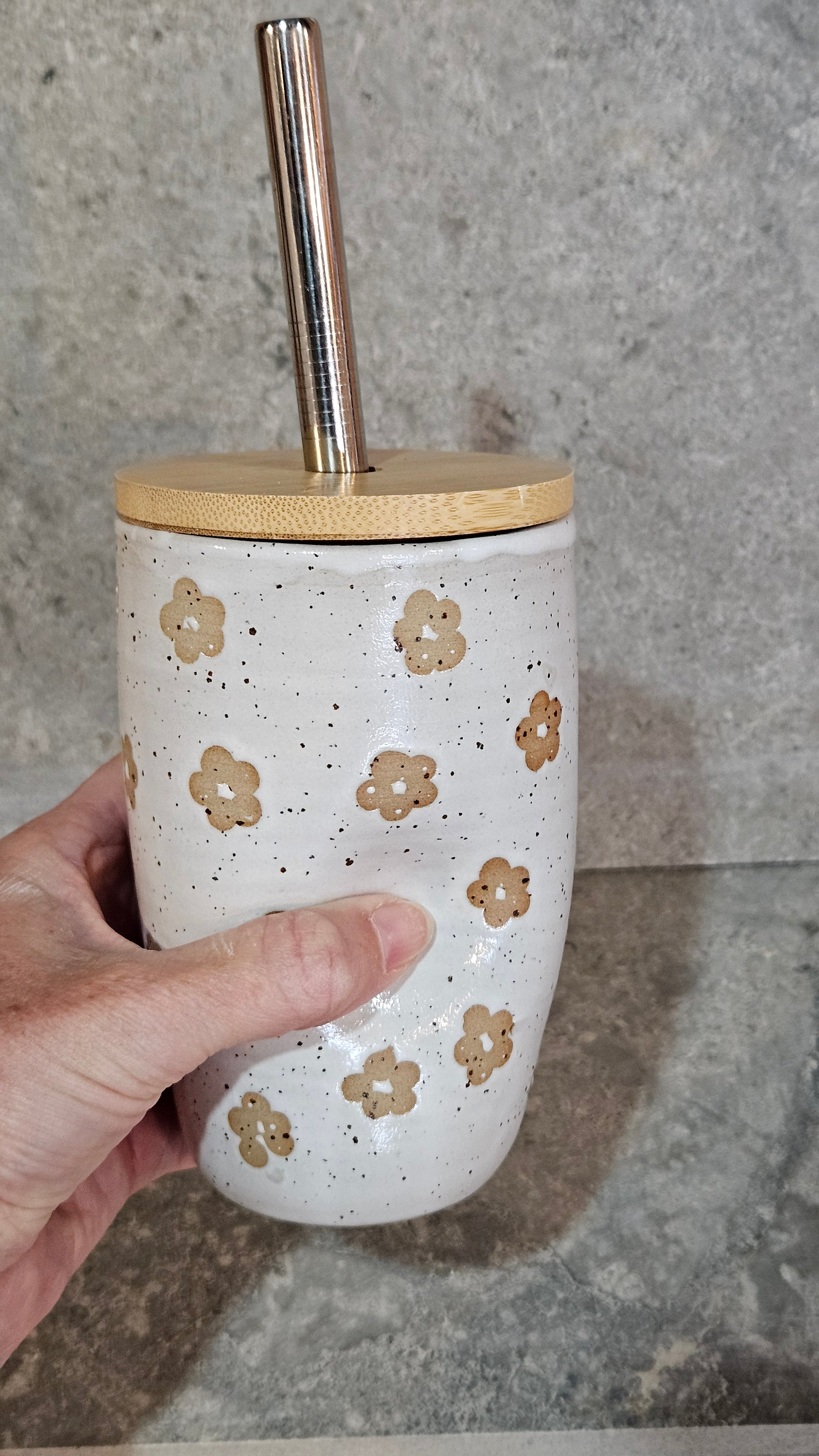 Handcrafted by me in my home studio, each of these gorgeous smoothie cups is perfectly unique with a super comfy thumb dent that makes them a joy to hold. Created out of beautiful, stoneware clay, they are then decorated, dried and fired for the first time. Once fired, they are sanded, washed and glazed in hard-wearing mid-fire glazes before being fired to 1215°C. Once cooled, they are sanded again for a super smooth, scratch free base. The glaze is a gorgeous glossy colour.